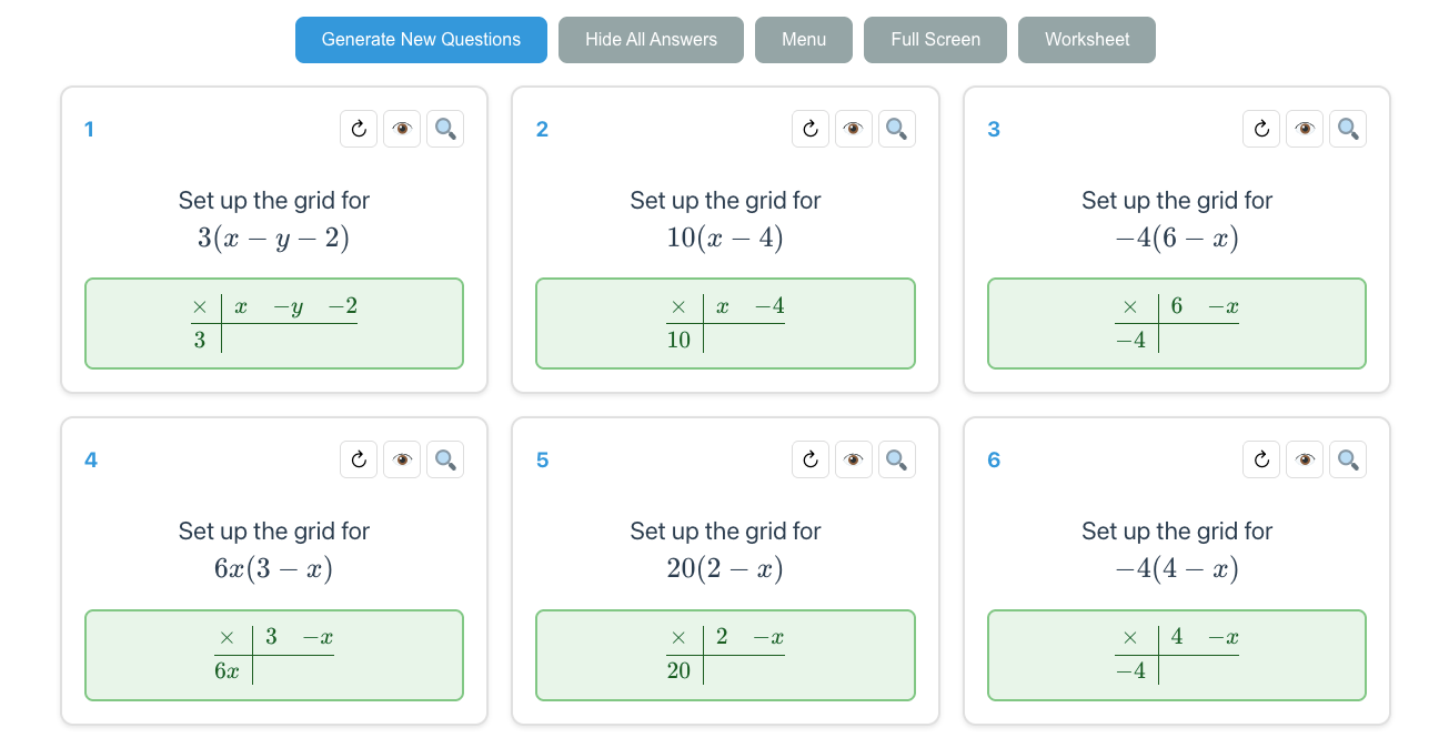 Answers can be revealed for individual questions or all questions. Here are the answers to the foundational skill of drawing the grid in the expanding single brackets topic.