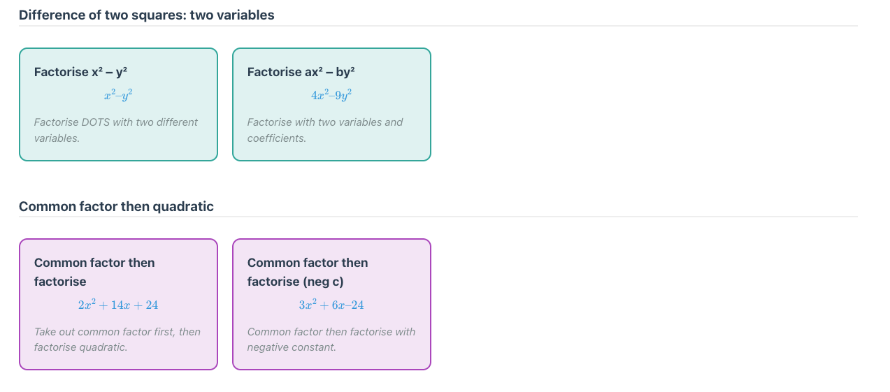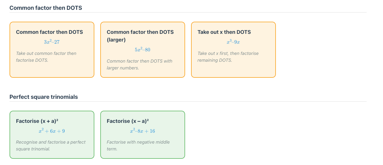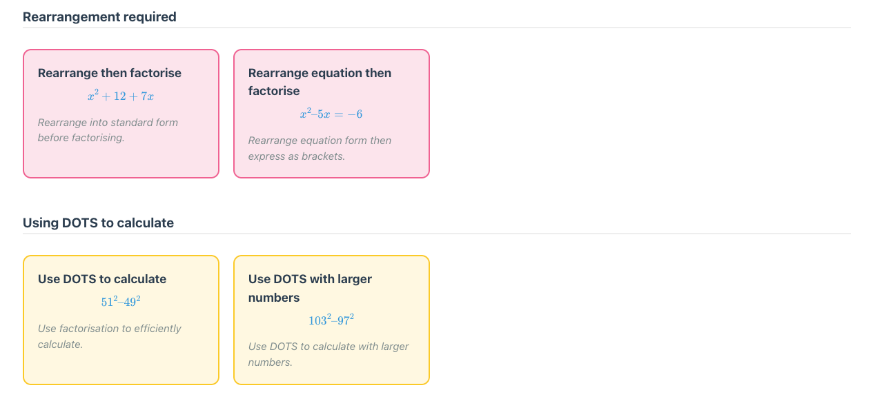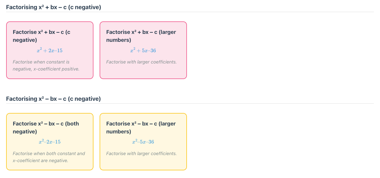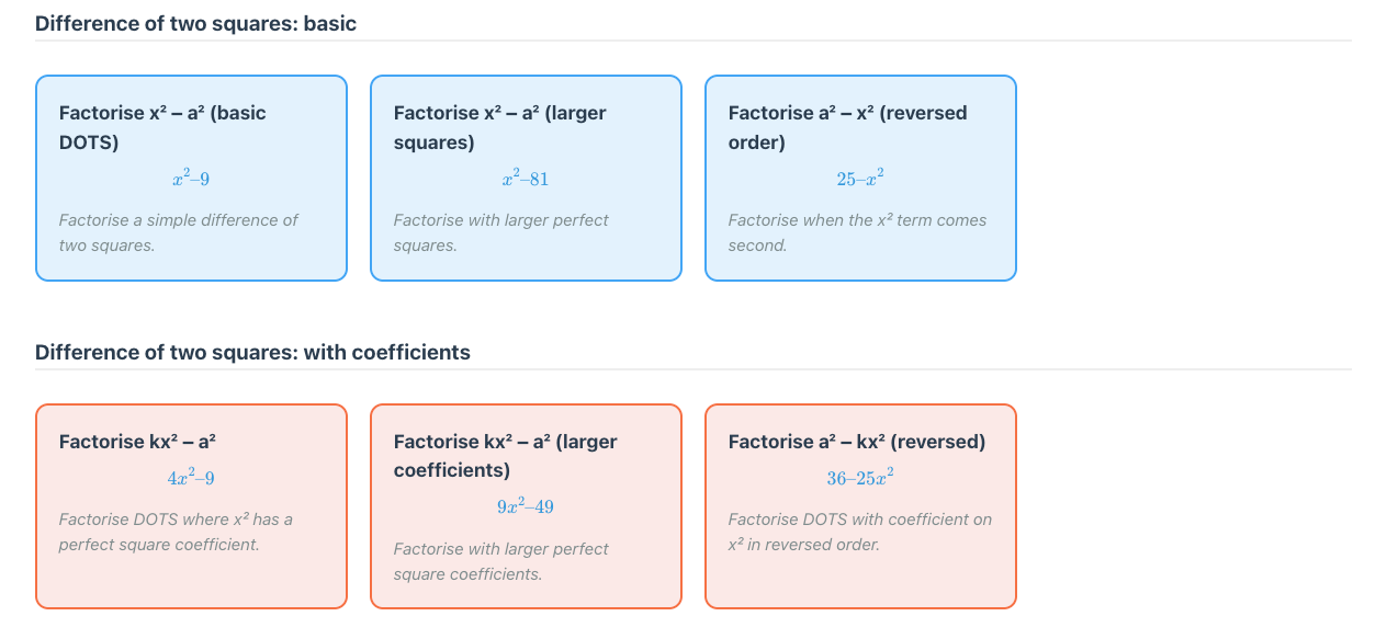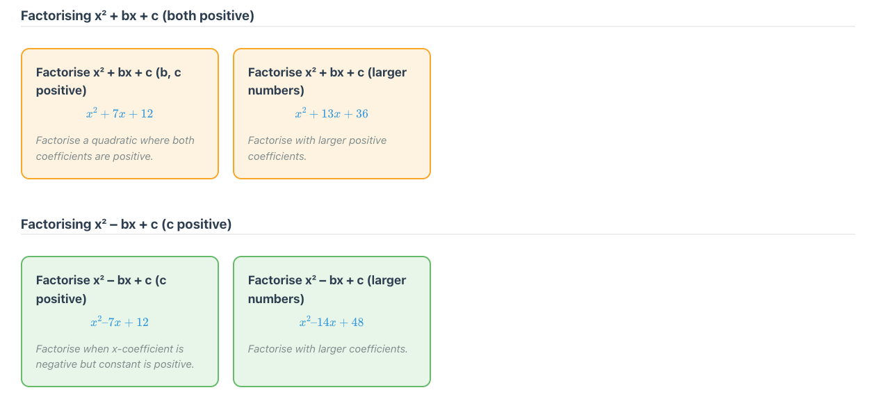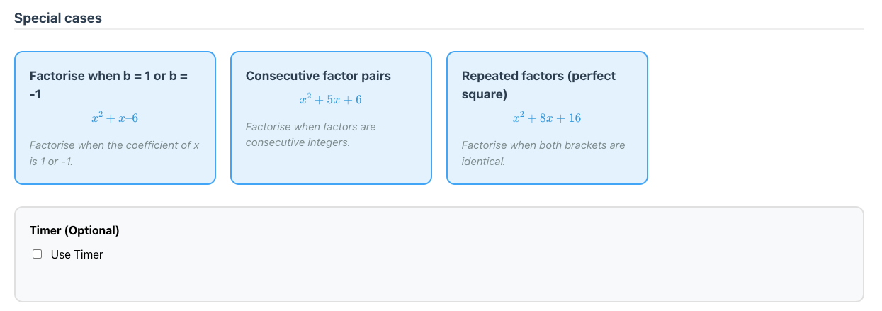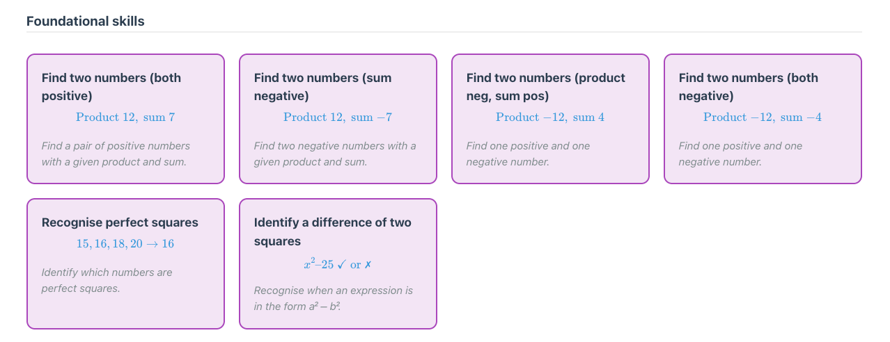 Each topic is broken down into skills, typically 25 to 40. The teacher or student can select one skill to practice, or as many as they like. Here is the breakdown for factorising monic quadratics.