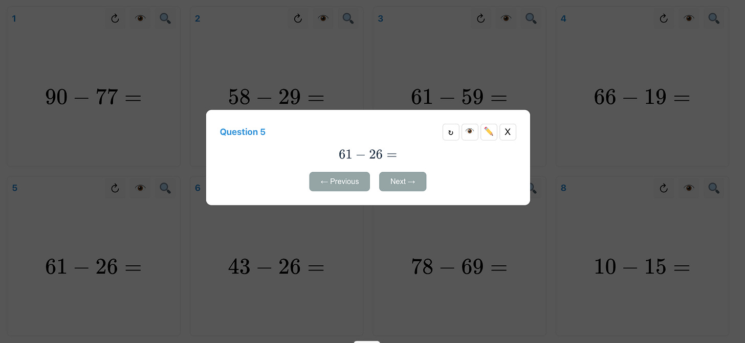 I can now give the prompt to Gemini or Claude, and it consistently produces Super 8 pages that look great. I still need to review each page carefully and provide detailed feedback, but my input is now primarily pedagogical in nature, such as adjusting the range of numbers used, or consolidating skills. I genuinely enjoy the process.