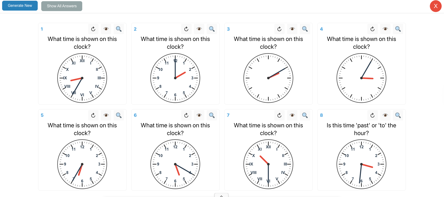 Alternatively, the teacher may wish to project the answers full-screen. Here is full-screen mode for telling the time from an analogue clock: