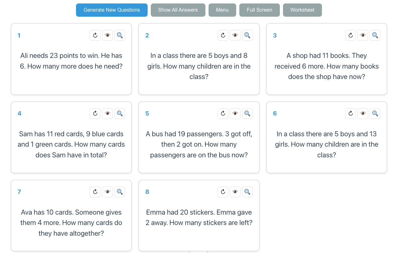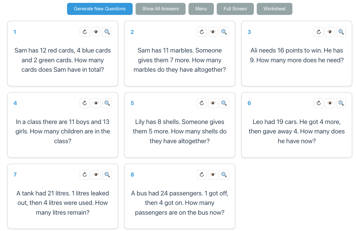 The teacher or student can choose to change any individual question, or change the whole lot at the click of a button. For example, here are the first two sets of questions generated by selecting a few addition and subtraction skills from the Four Operations in Context topic: