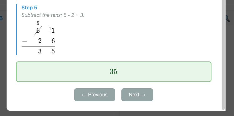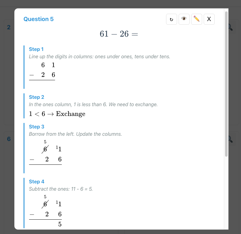 Teachers or students can access detailed, step-by-step solutions to any question, complete with supporting commentary. Here is an example from the written subtraction topic: