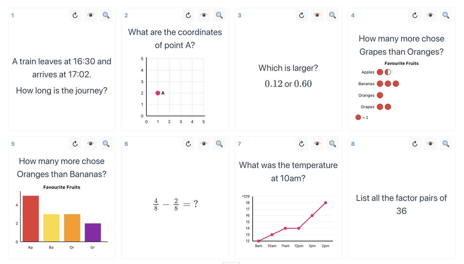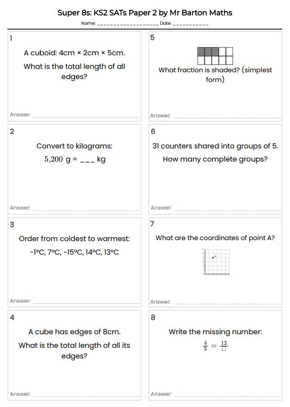 The questions can be instantly turned into a one-page worksheet (answers are on page 2). Here is a worksheet for SATs Paper 2 essential skills (I have created mixed-topic essential skills Super 8s for each year from Year 1 up to A Level).